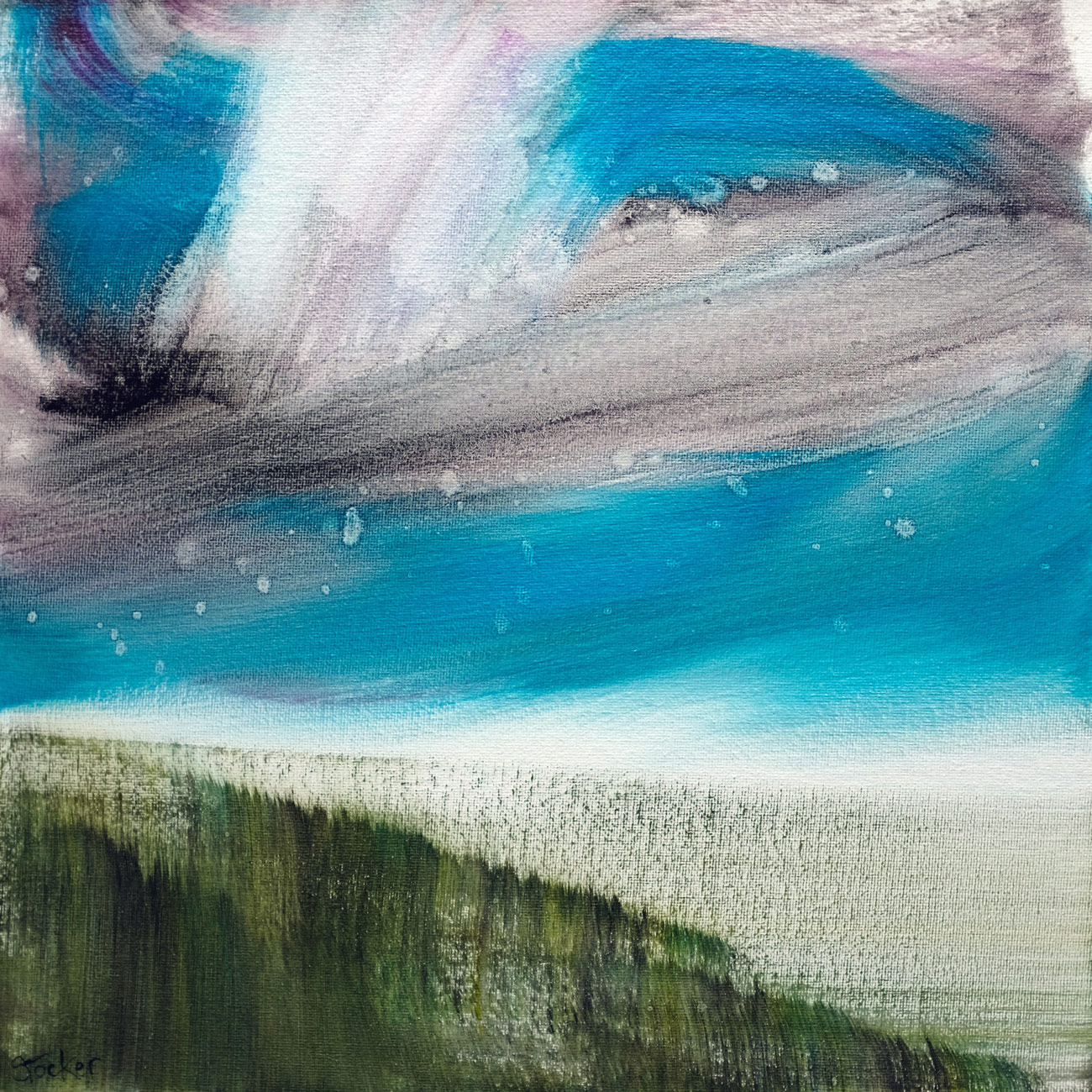 “3 colour palette, one brush. Forest and sky, interconnected. Inspired by Brechfa Forest and LLanllwni Mountain where I live.”