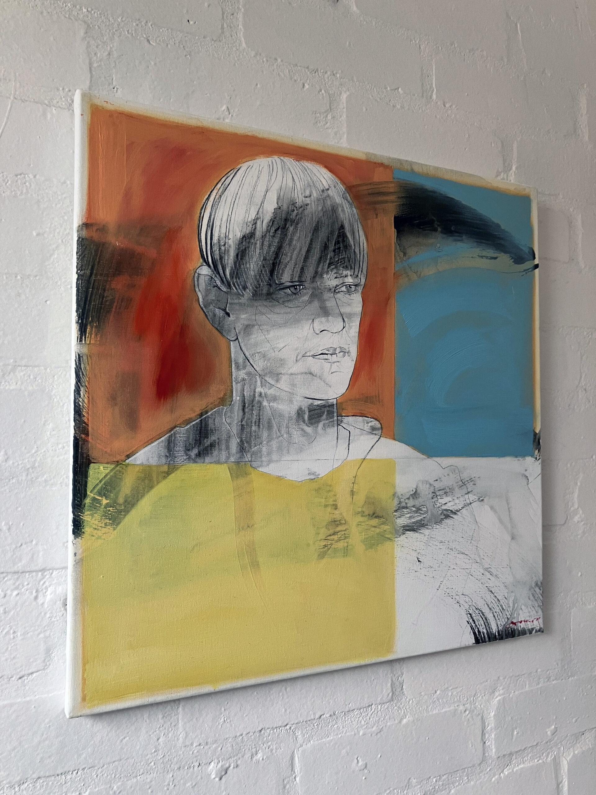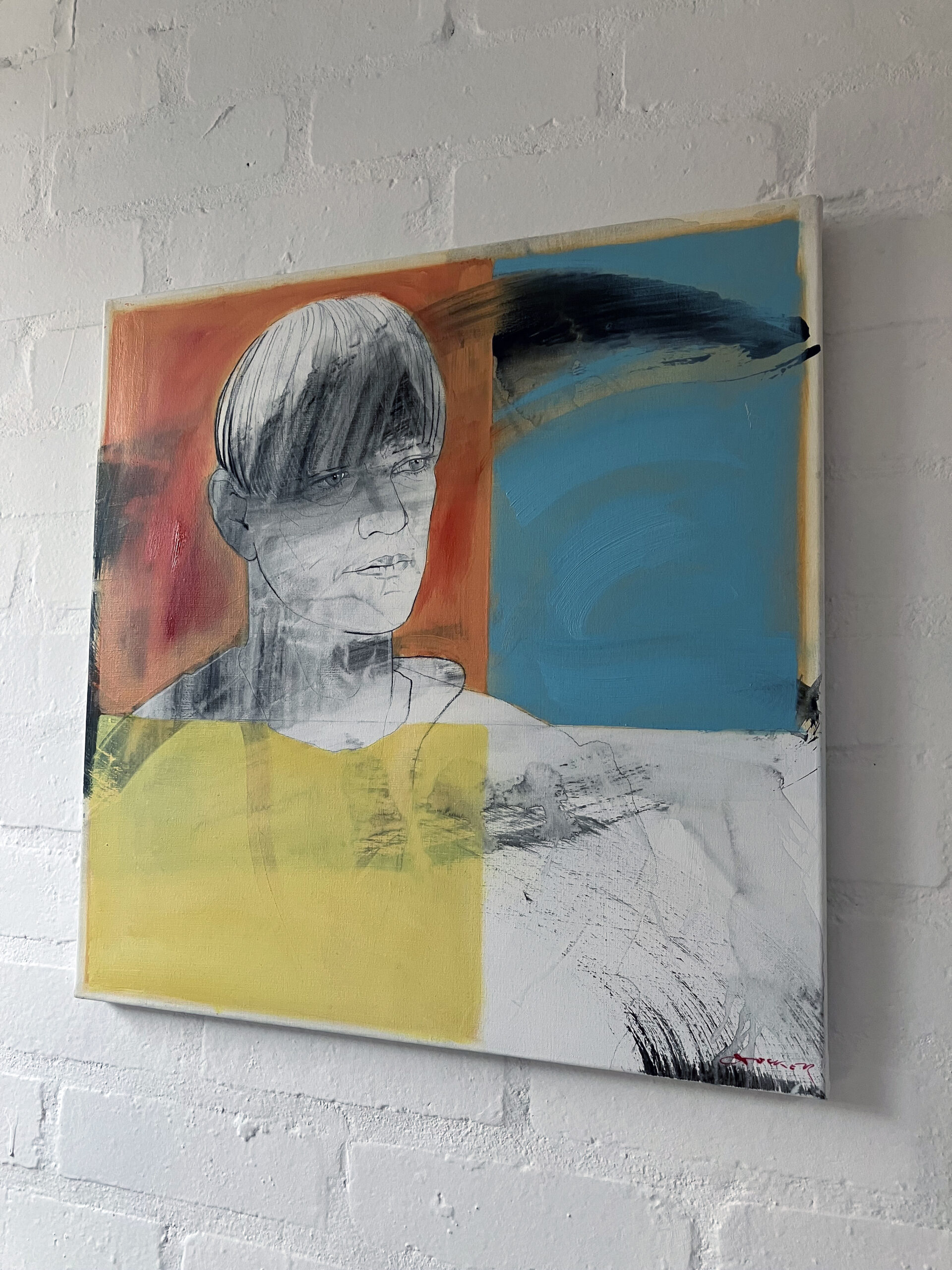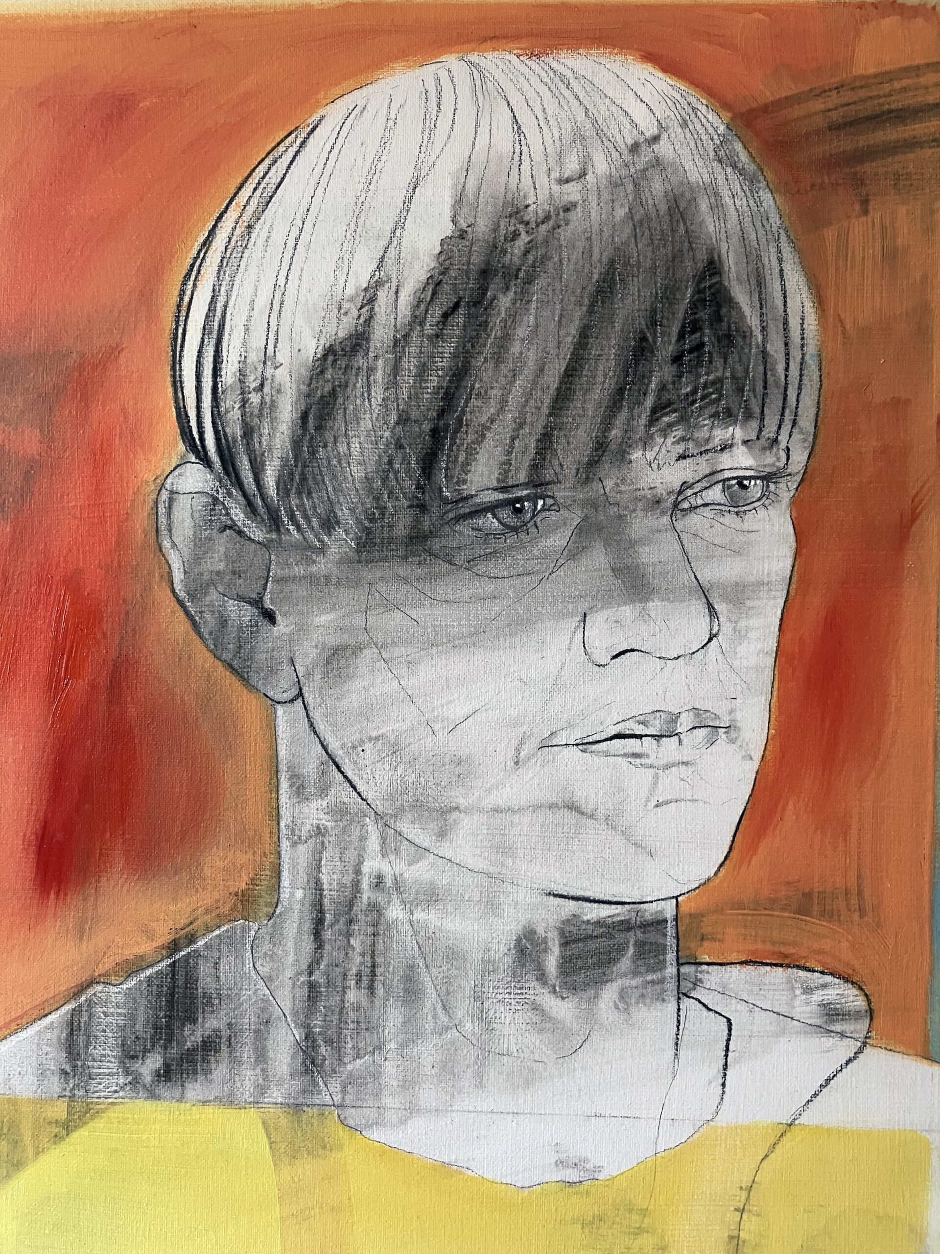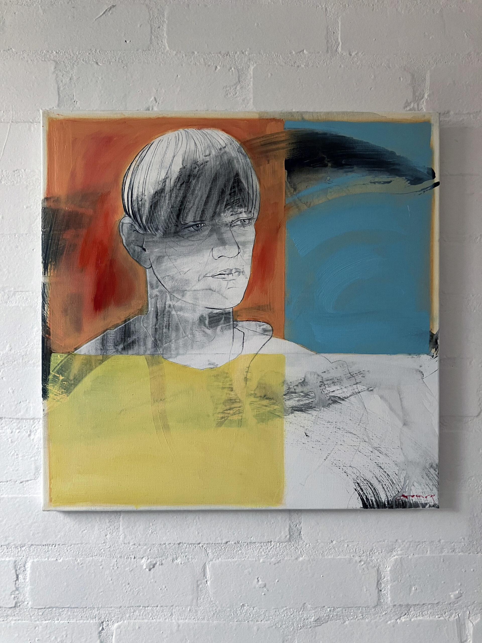This painting is from the Distant Minds series, 2020. A visual correspondence working from my portrait drawings and connecting them with my abstract paintings. A balance of painting and drawing. Abstract and figurative elements in equal measure.