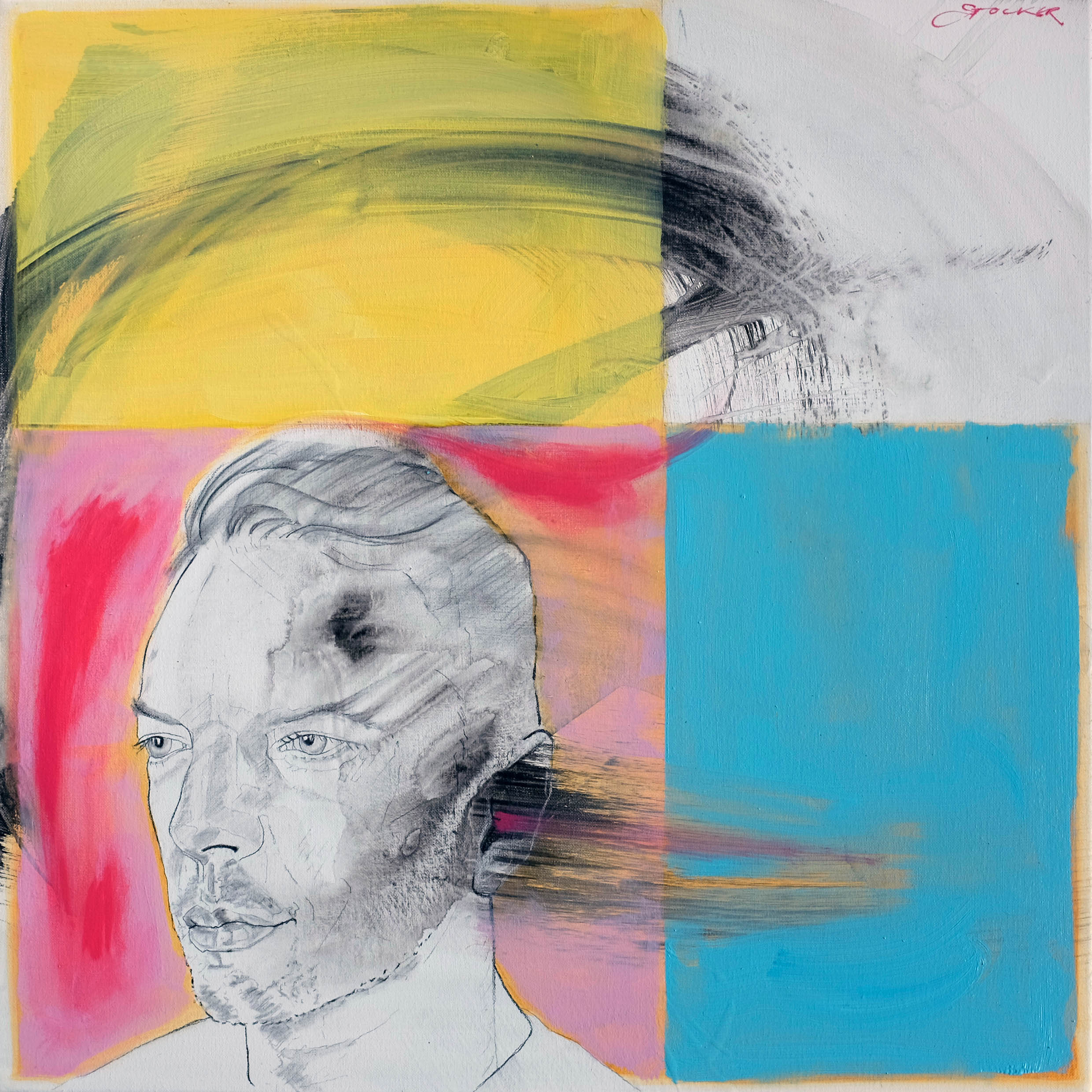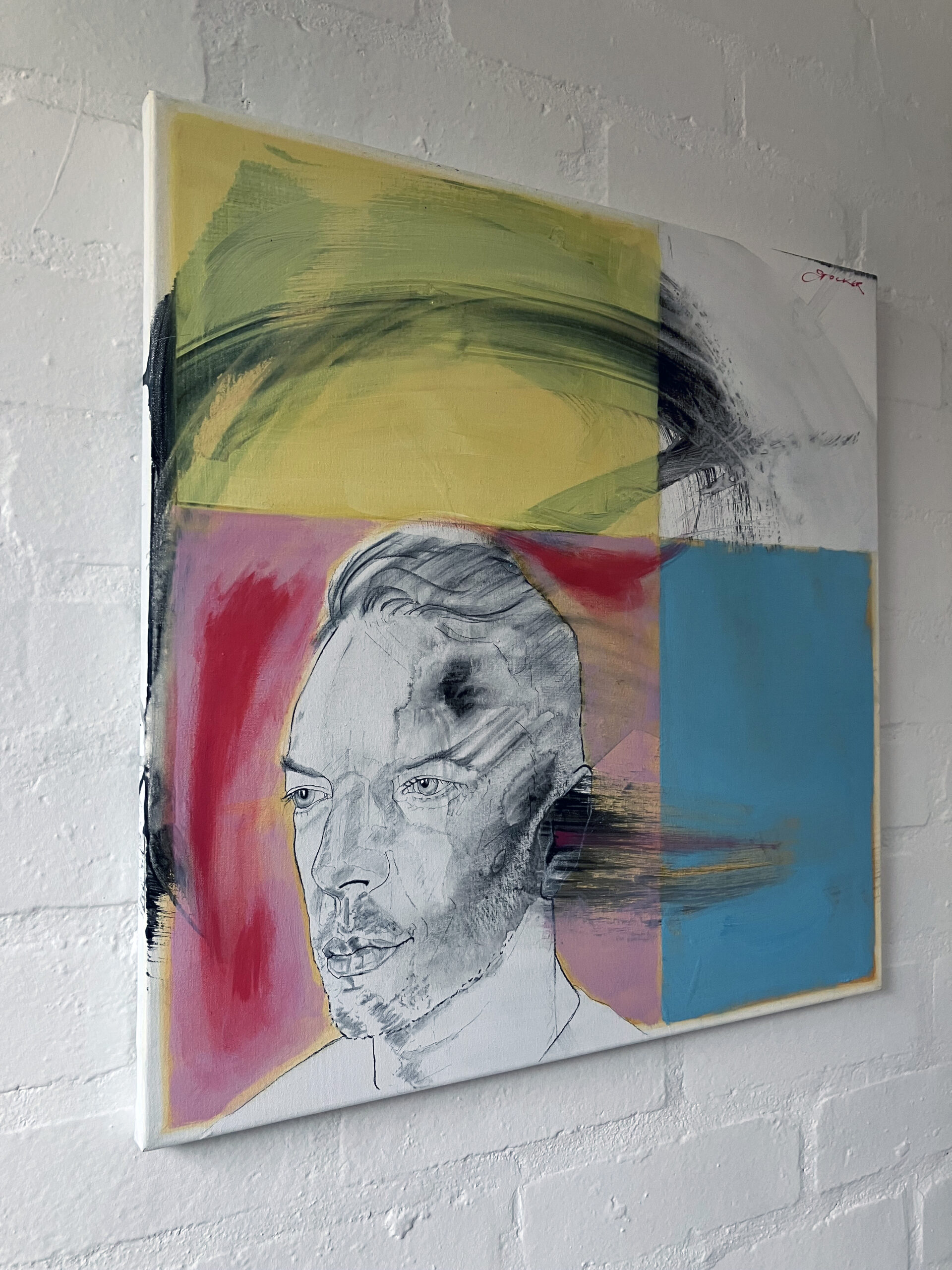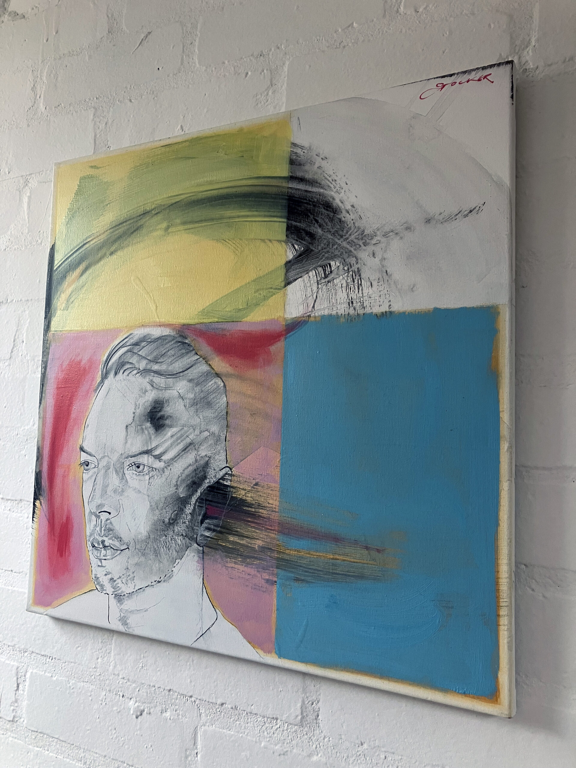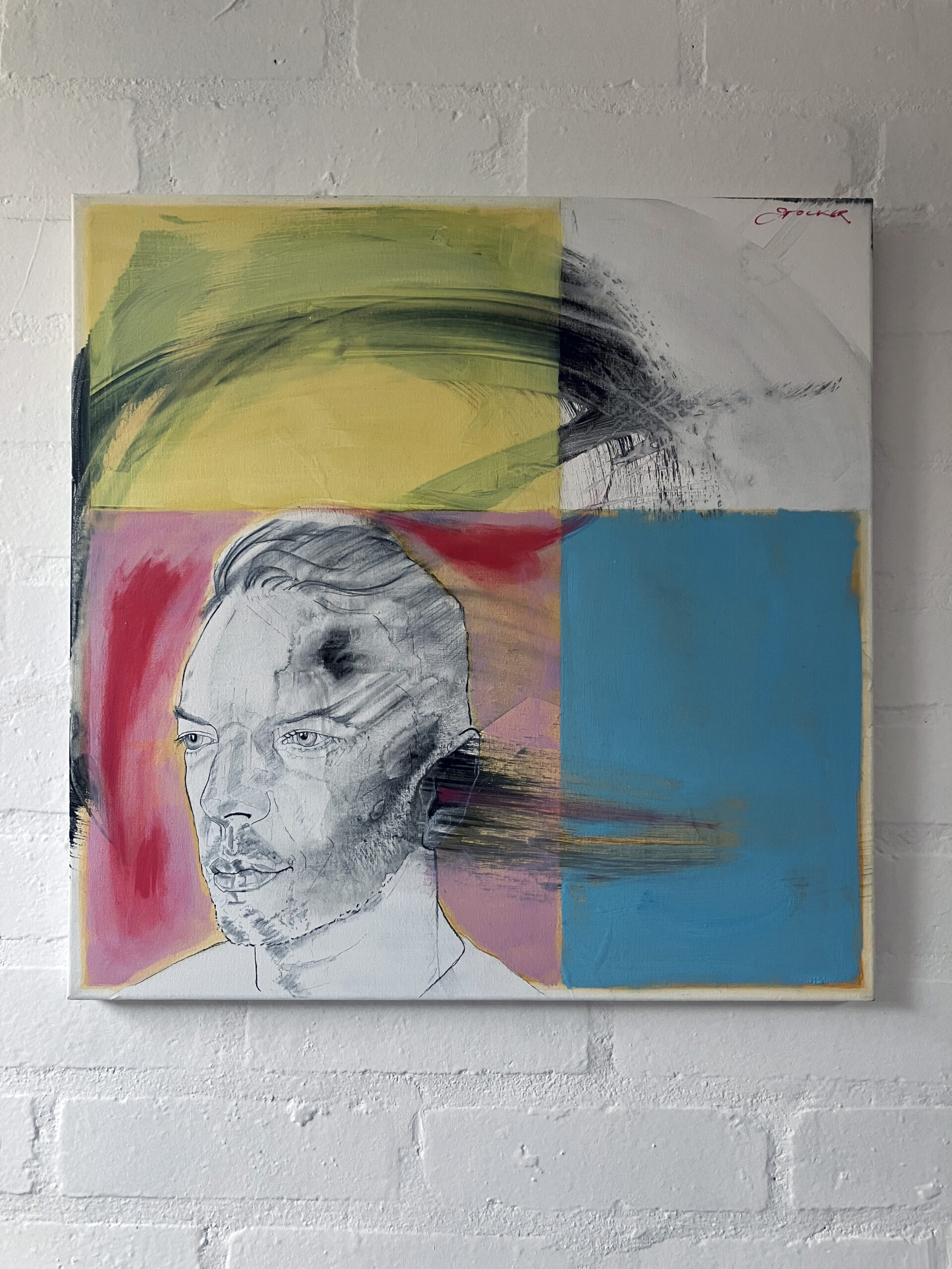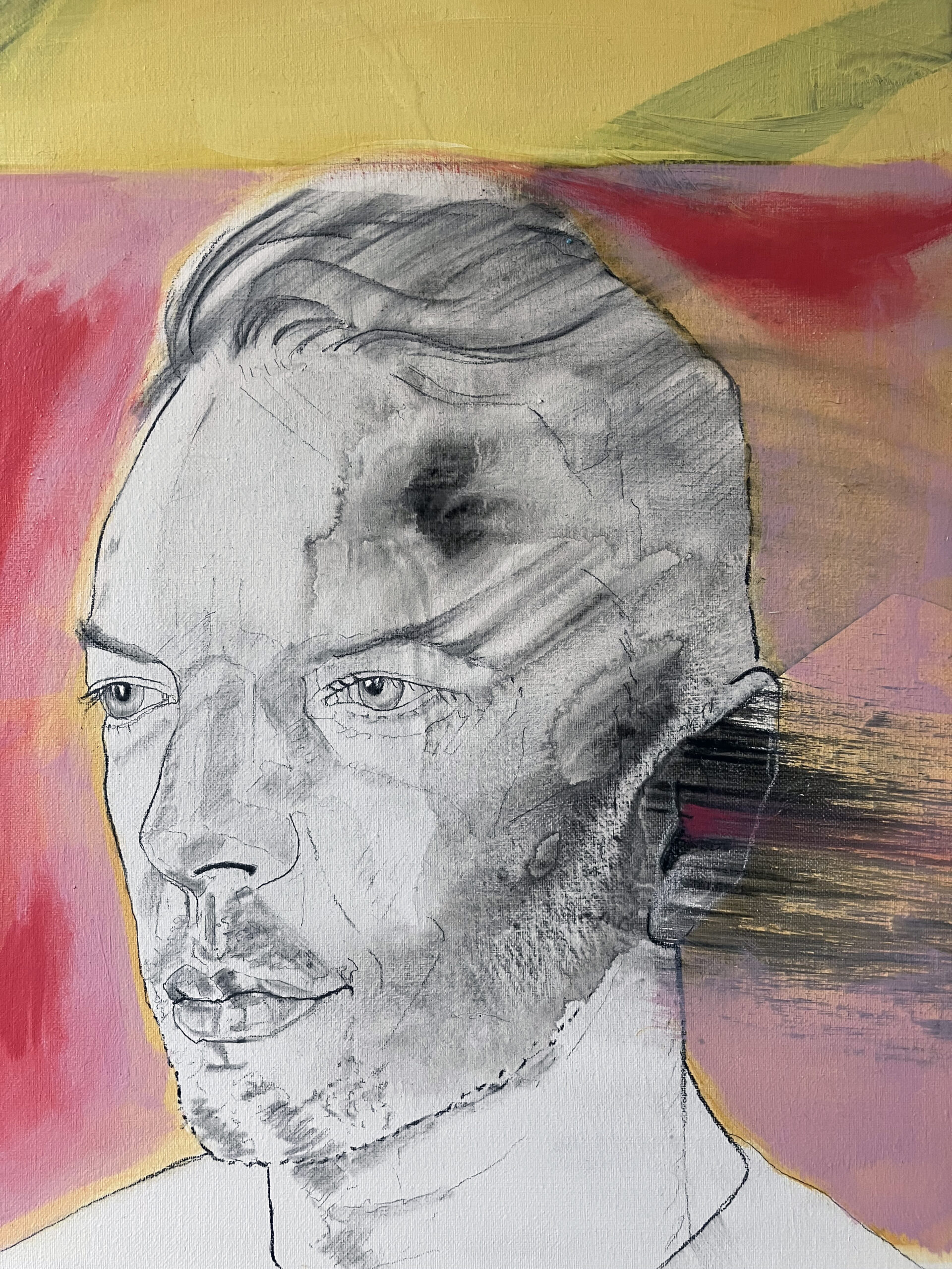 This painting is from the Distant Minds series, 2020. A visual correspondence working from my portrait drawings and connecting them with my abstract paintings. A balance of painting and drawing. Abstract and figurative elements in equal measure.