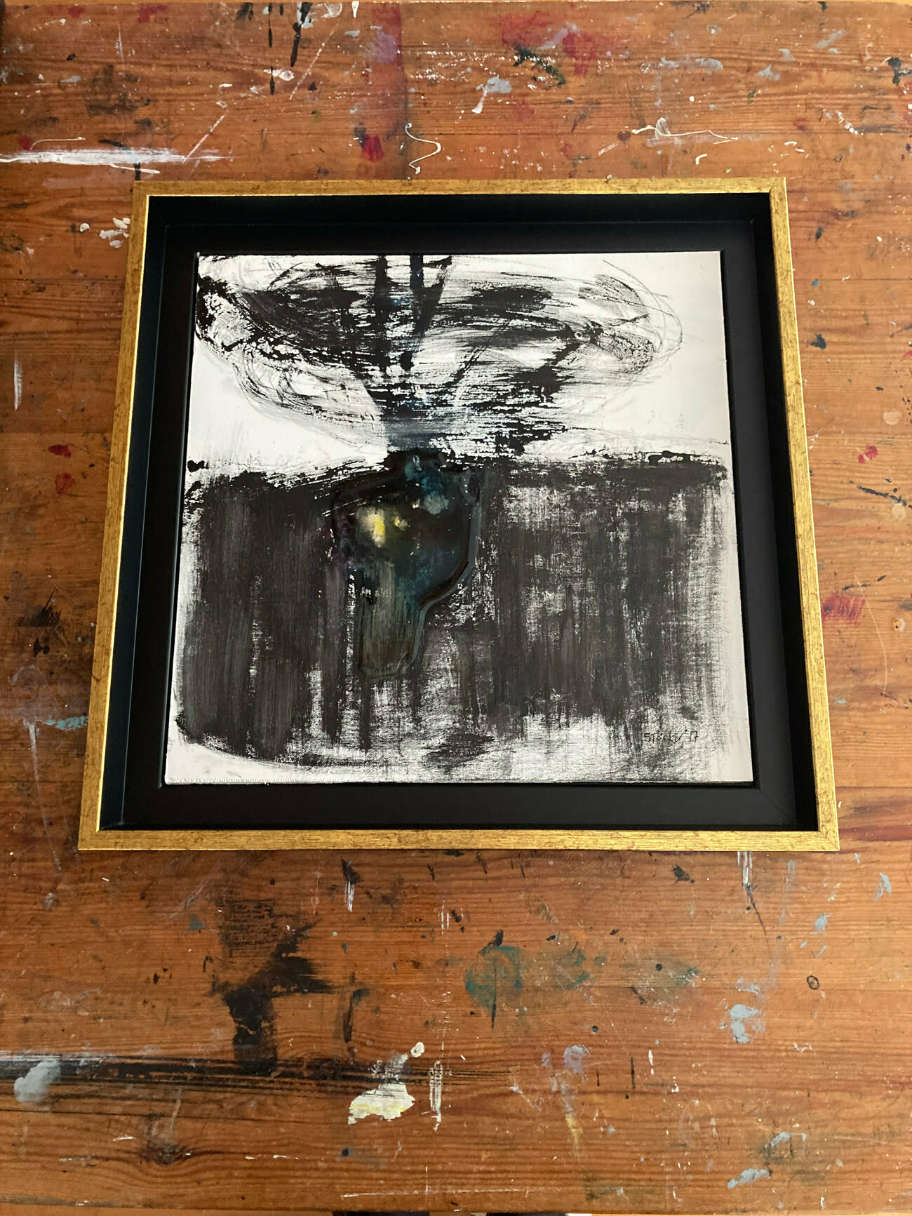 37x37x4cm and is presented in a ‘Larson Juhl, ARQ Bari’ black and gold float frame with a foil/paint finish.